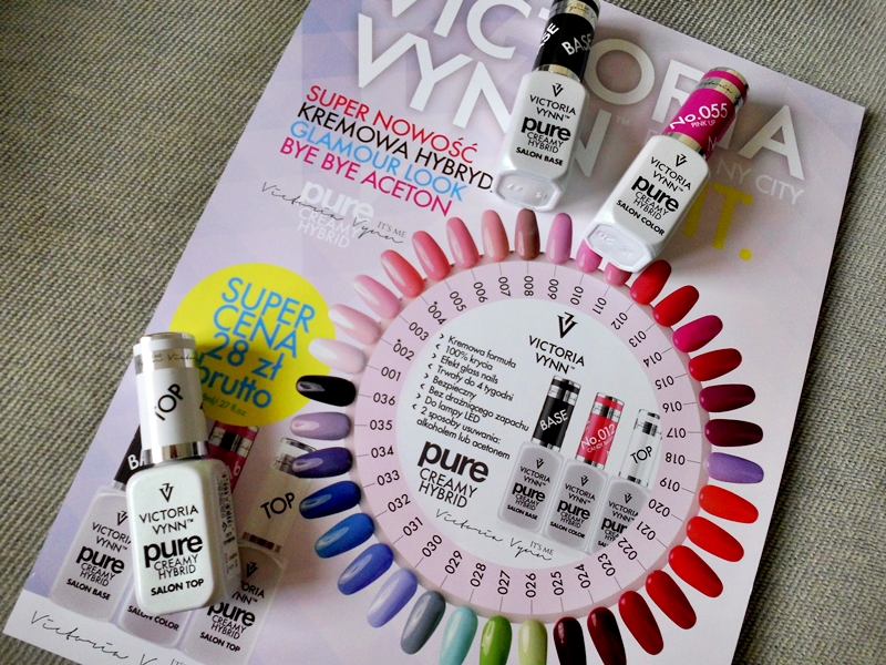 Jakiś czas temu odezwała się do mnie Pani Olga z firmy Victoria Vynn. Marka ta była mi jeszcze mało znana. Ale w temacie hybryd jestem już ponad półtora roku, więc z chęcią zgodziłam się na przetestowanie czegoś nowego. I tak w tamtym tygodniu przyjechała do mnie paczka z produktami z serii Pure Creamy Hybrid: PURE baza, top, Pure kolory 055, 062, 045 płyn alco remover, mata.